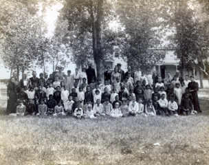 Photograph of the Darlington Arapahoe School, Darlington, OK. Numbered Id's = 1. Miss Stewart, 2. W.E. Catlin, 3. W.W. Jenkin, 4. W.N. Parker, 5. John Murphy, 6. Miss Bennett, 7. Miss Settle, 8. Rev. Dwire, 9. Mrs. Dwire, 10. Little Edna Parker, 11. Miss Blackburn, 12. Miss Nellie Morrison, 13. Marine D. Yackett, 14. Miss Russell. Photo by Christopher C Stotz, El Reno, Oklahoma Territory, June 26, 1891
