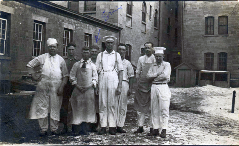 Members of the Culinary Department standing outside of the main kitchen at the St. Peter State Hospital during the 1920's, according to sources at the hospital. A note on the reverse side indicates that the man who is the third from the left is Fritz Miller and the man who is the fourth from the left is Ernie Gustafson. Minnesota State Archives
