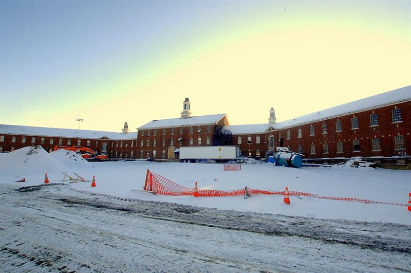 Stretching in three ways across the frozen Fairfield Hills campus are the brick wings of Greenwich House. Behind the sprawling former state hospital building, sunrise brightens the landscape where the new Newtown Youth Academy now stands. Once Greenwich is razed, a greenway and central parking will serve the youth academy, a new baseball diamond that is behind the building’s left side, and the renovated building that will serve as a new town hall. 2009. http://newtownbee.com/News/2009-02-05__10-44-09/Work+Begins+At+Bridgeport+Hall+After+Many+Delays