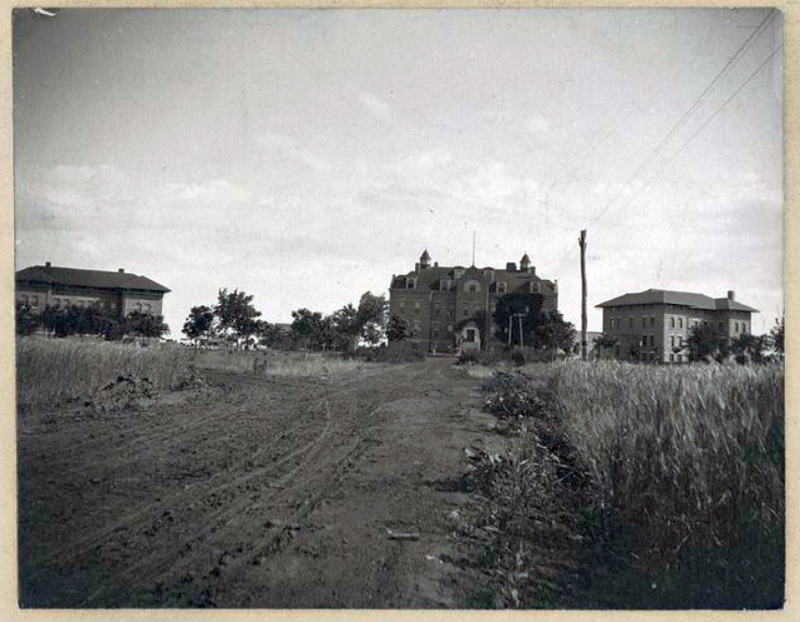 View of main building at 2 dormitories, 1895. Credit- Kansas Historical Society