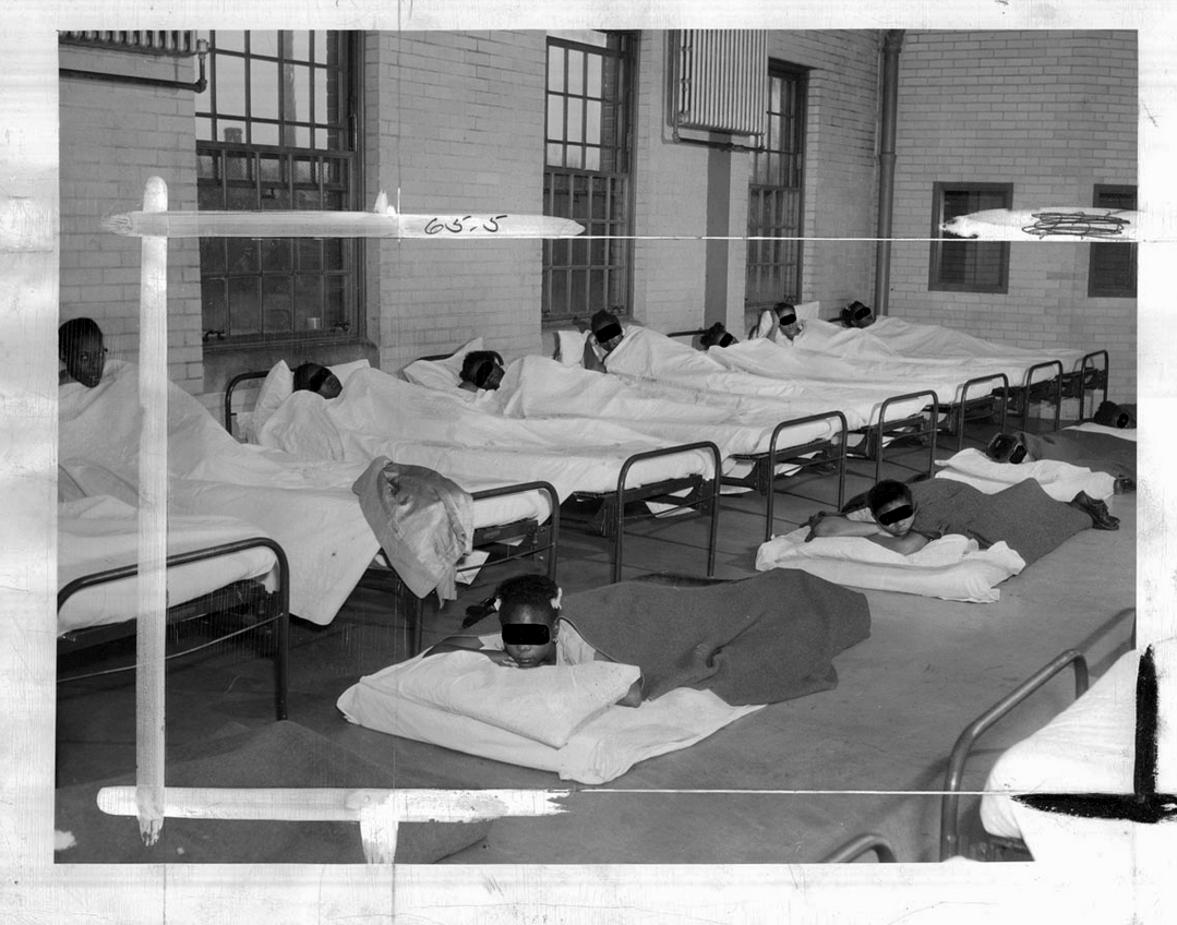 Teenage girls sleep on mattresses between rows of beds in the children’s building at Crownsville State Hospital. This is the only place in Maryland for feeble-minded black girls. Photo by Robert F. Kniesche, January 11, 1949. Baltimore Sun archives