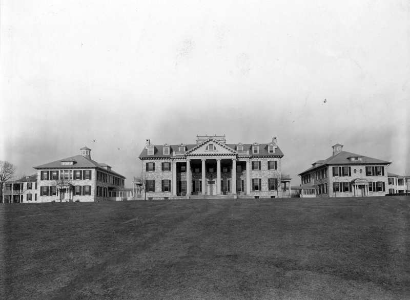 Exterior view of three facility buildings at Rosewood State Training School, ca. 1910-1914.