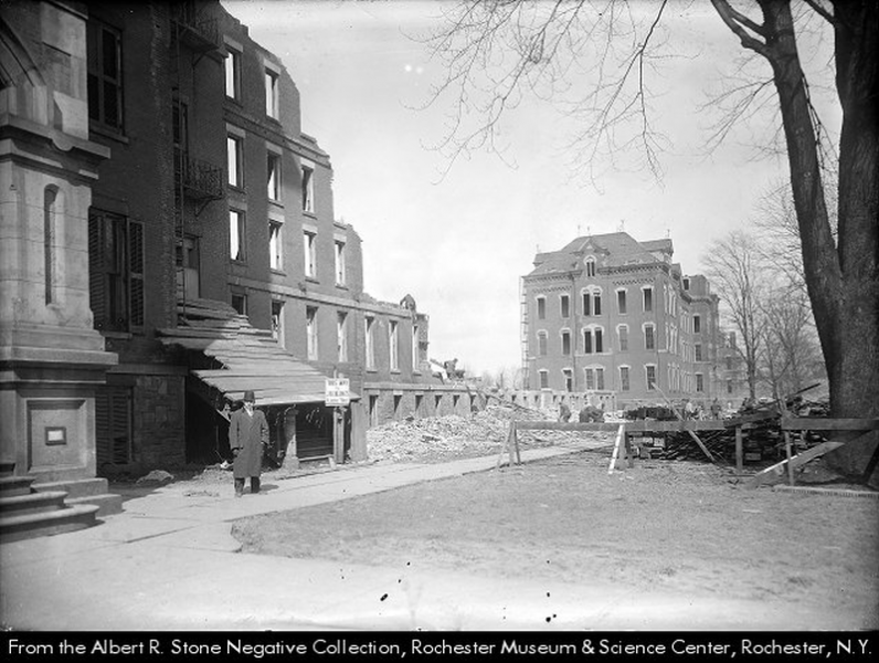 This photograph shows the buildings of the old State Industrial School in Rochester in various stages of demolition. The land, acquired by the city of Rochester in 1910, is being cleared to make way for Exposition Park. Credit-Albert R. Stone Negative Collection, Rochester Museum & Science Center