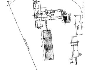 Second wing of asylum, hospital & emergency hospital from 1912 Sanborn map, updated in 1950.