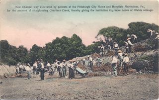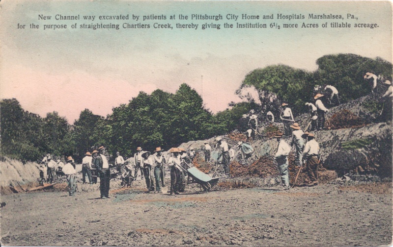New Channel way excavated by patients at the Pittsburgh City Home and Hospitals, Marshalsea, PA for the purpose of straightening Charters Creek, thereby giving the Institution 6 and 1/2 more acres of tillable acreage.
