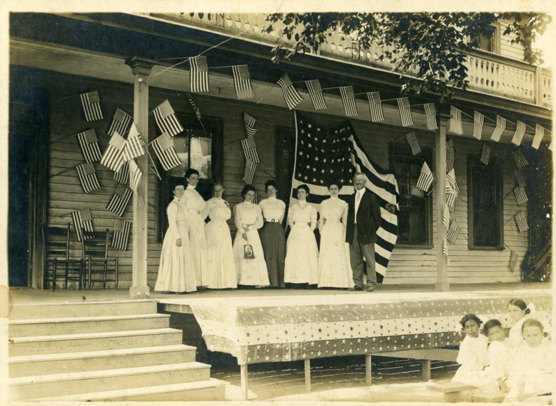 Photograph of faculty on the porch of a building with an American flag during a Fourth of July Celebration at Wheelock Academy. Year unknown.
